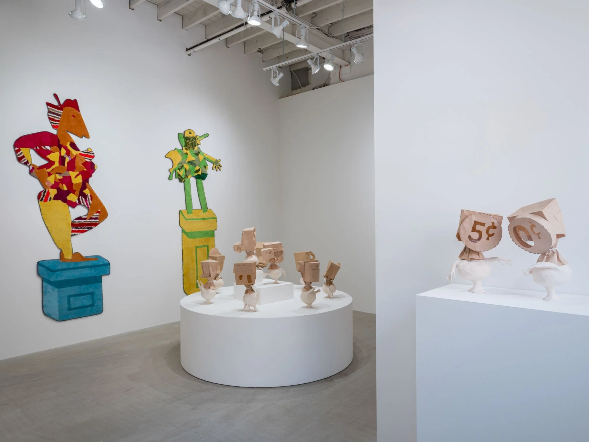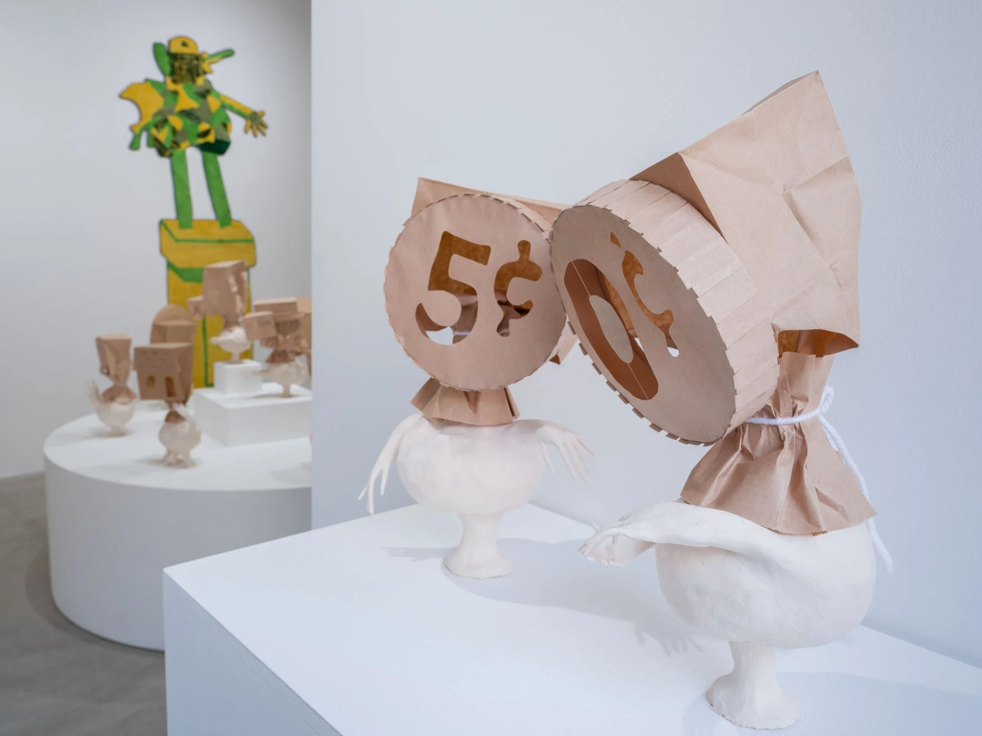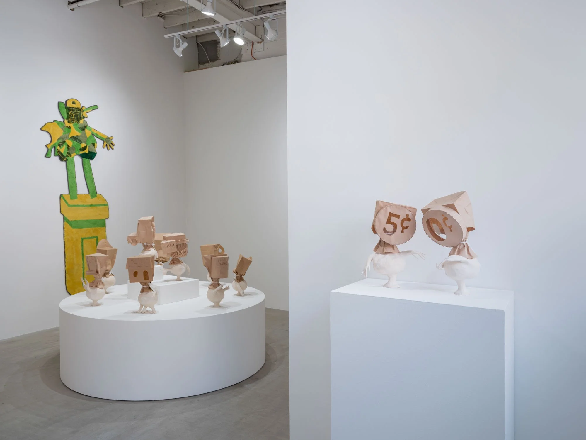 Heather Rule gets this all wrong by using combinations of ceramic and paper materials to create embodied forms that appear ephemeral and changeable. With the impermanent and familiar materiality of brown paper, the heads of these sculptures—including depictions of dentures, a rudimentary house form, and a pack of Du Maurier Lights, among others—evoke the fragmentary precision of certain persistent memories, equally vulnerable to change over time. Arms extend from their more corporeal ceramic pedestals, sometimes reaching out or gesturing to one another as if they are communicating, or at least keeping each other company. Together they form a collection of images in conversation, drawing out connections between seemingly disparate parts. There is a sort of tenderness and care to these objects. Now I am thinking, feeling, reflecting. No, this is not how this is supposed to go.