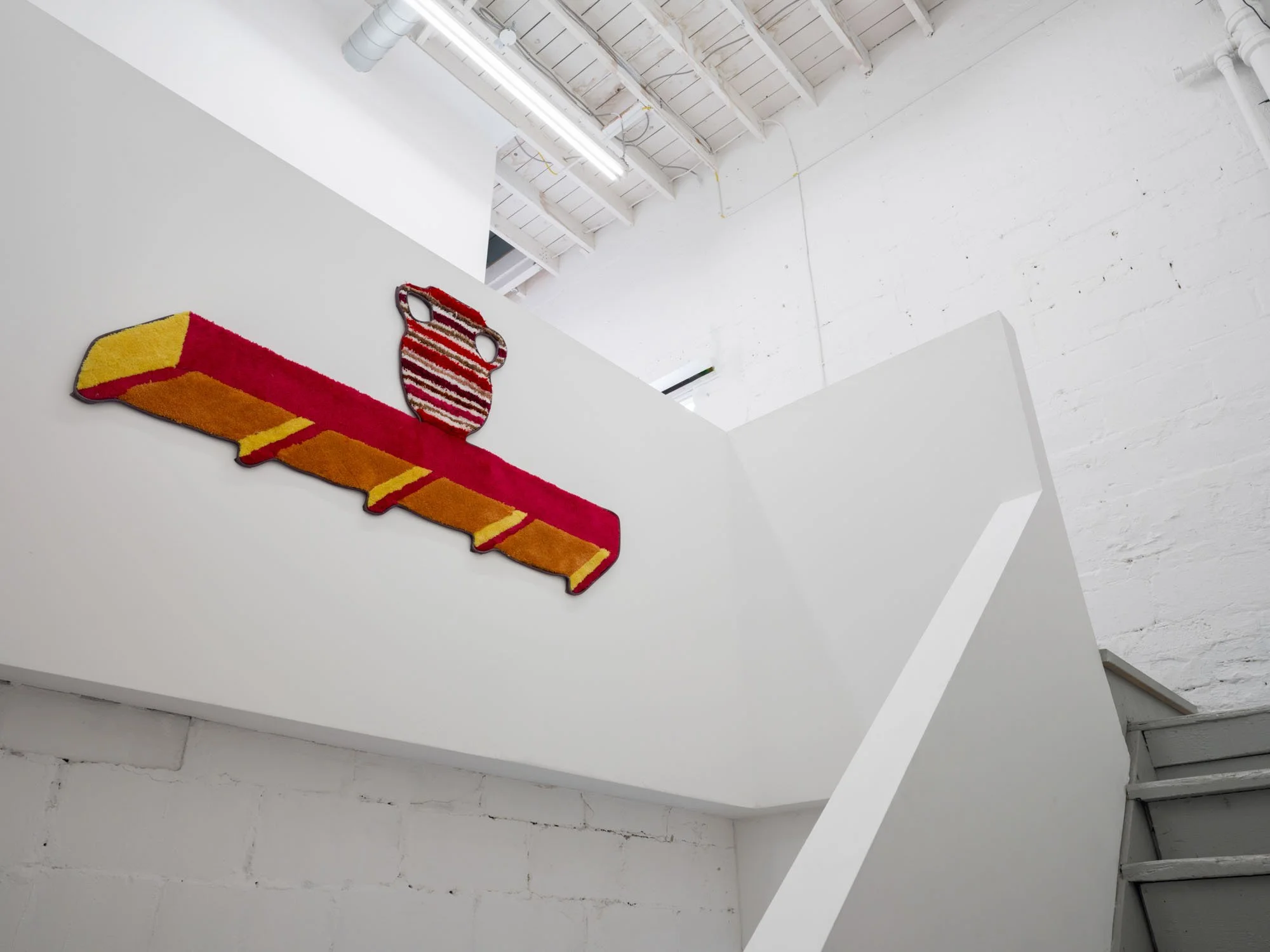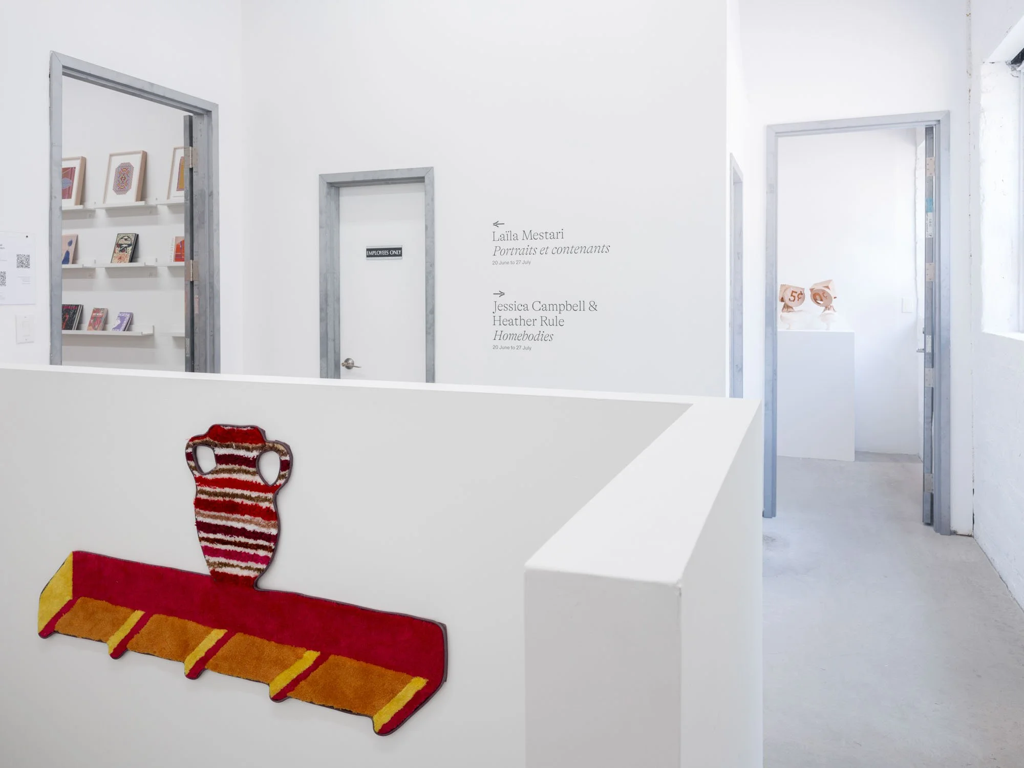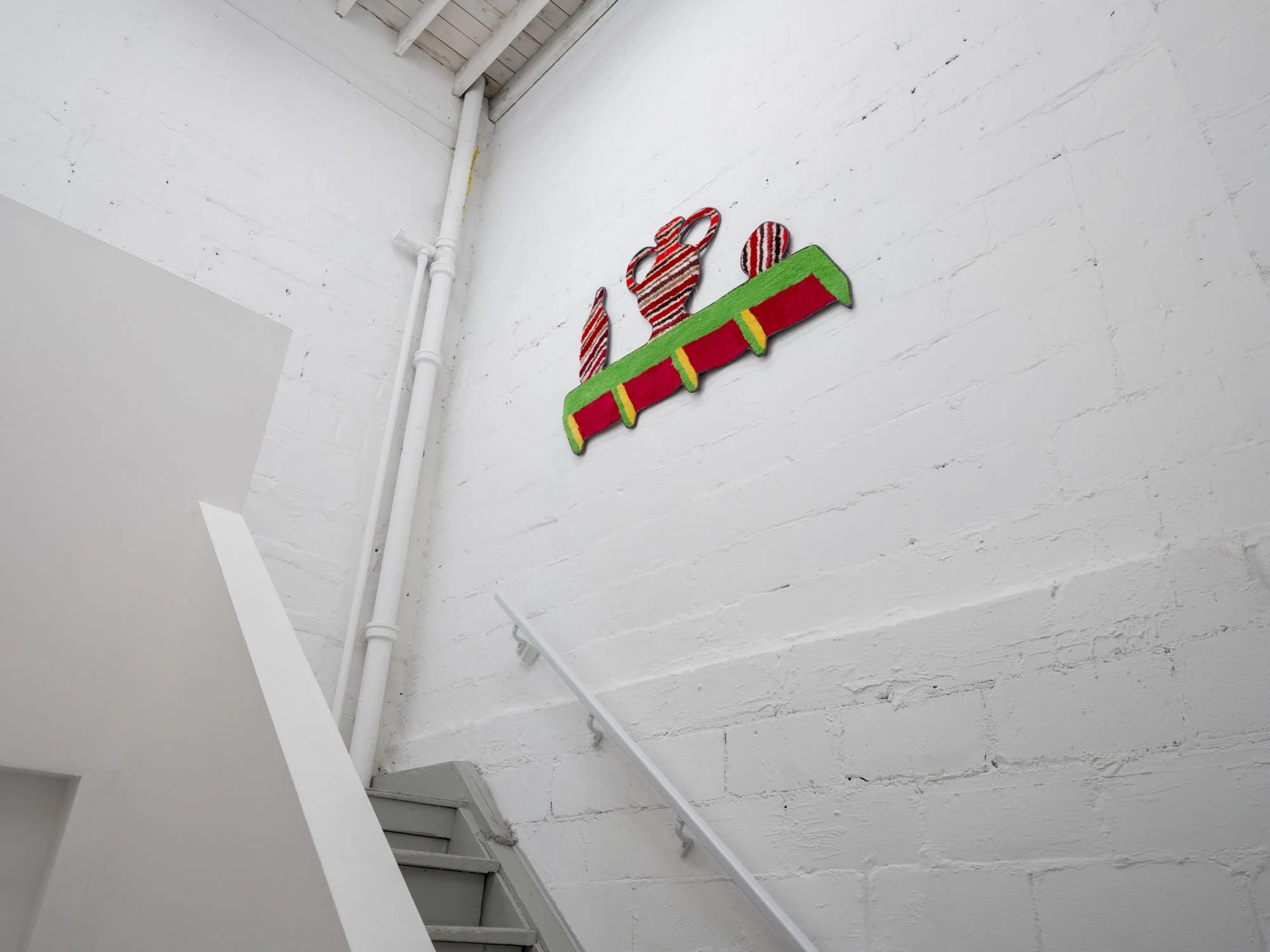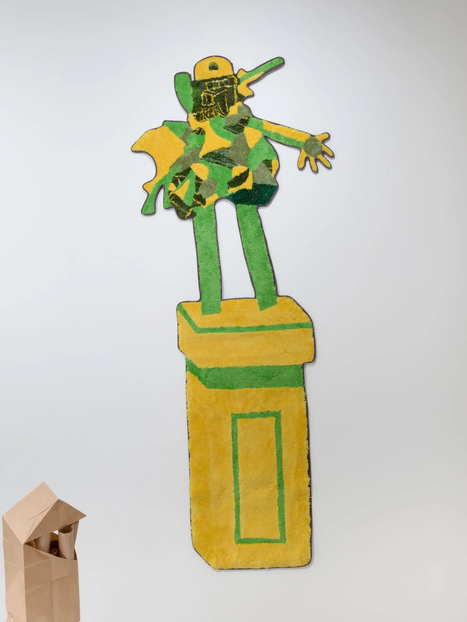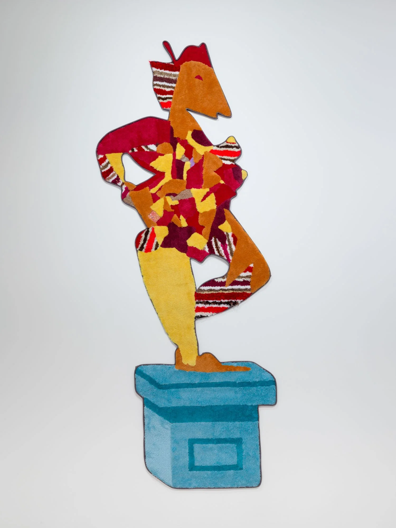 Then there are Jessica Campbell’s decorative objects on various shelves and plinths all made from collaged carpet. The first glaring issue with these sculptures is, of course, that they are missing a dimension. This missing axis is disguised by a sort of fool’s trompe l’oeil effect, where often incongruent, skewed views are rendered two-dimensionally, setting up different perspectives to support Man Cave decorations, statues for the Rec Room, and other pieces of decor that might be well suited to “a room of one’s own.” The titles of Campbell’s works (like Alcyoneus (Fighting my Dad about Climate Change)) allude to anecdotal histories that provide entry points to talk about bigger concerns and questions, working in tandem with the similarly relatable carpeting. Many of them are quite funny. Now I am laughing. What the hell is going on?