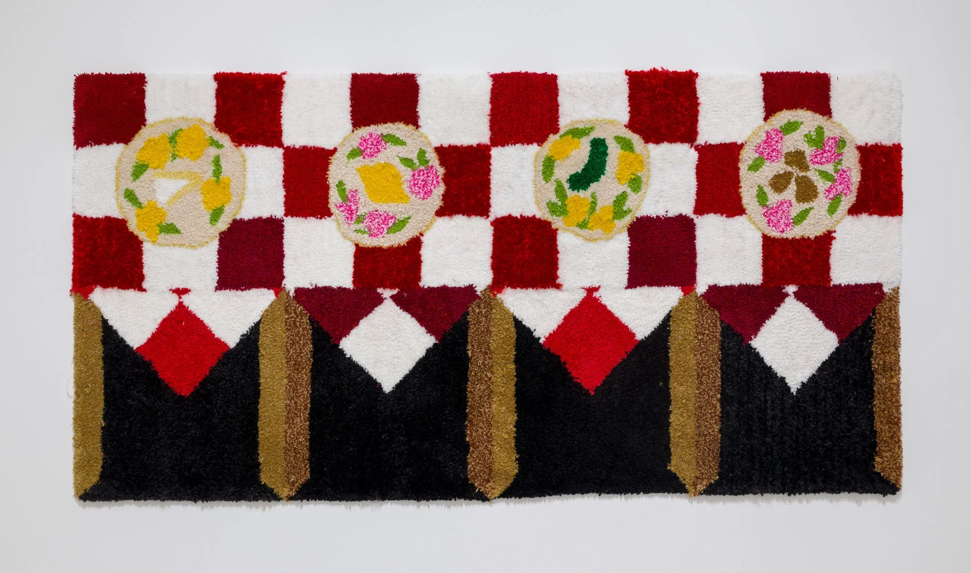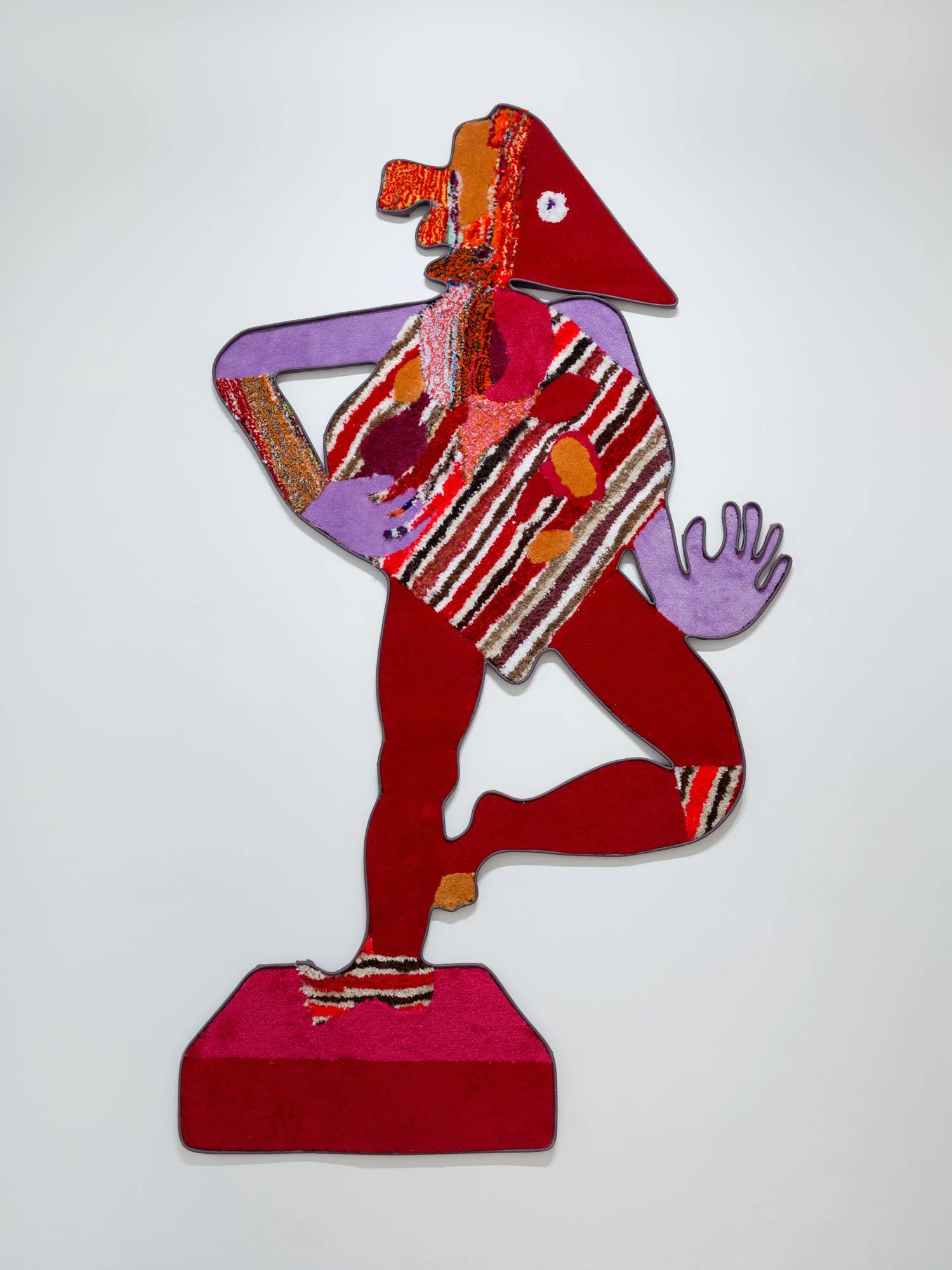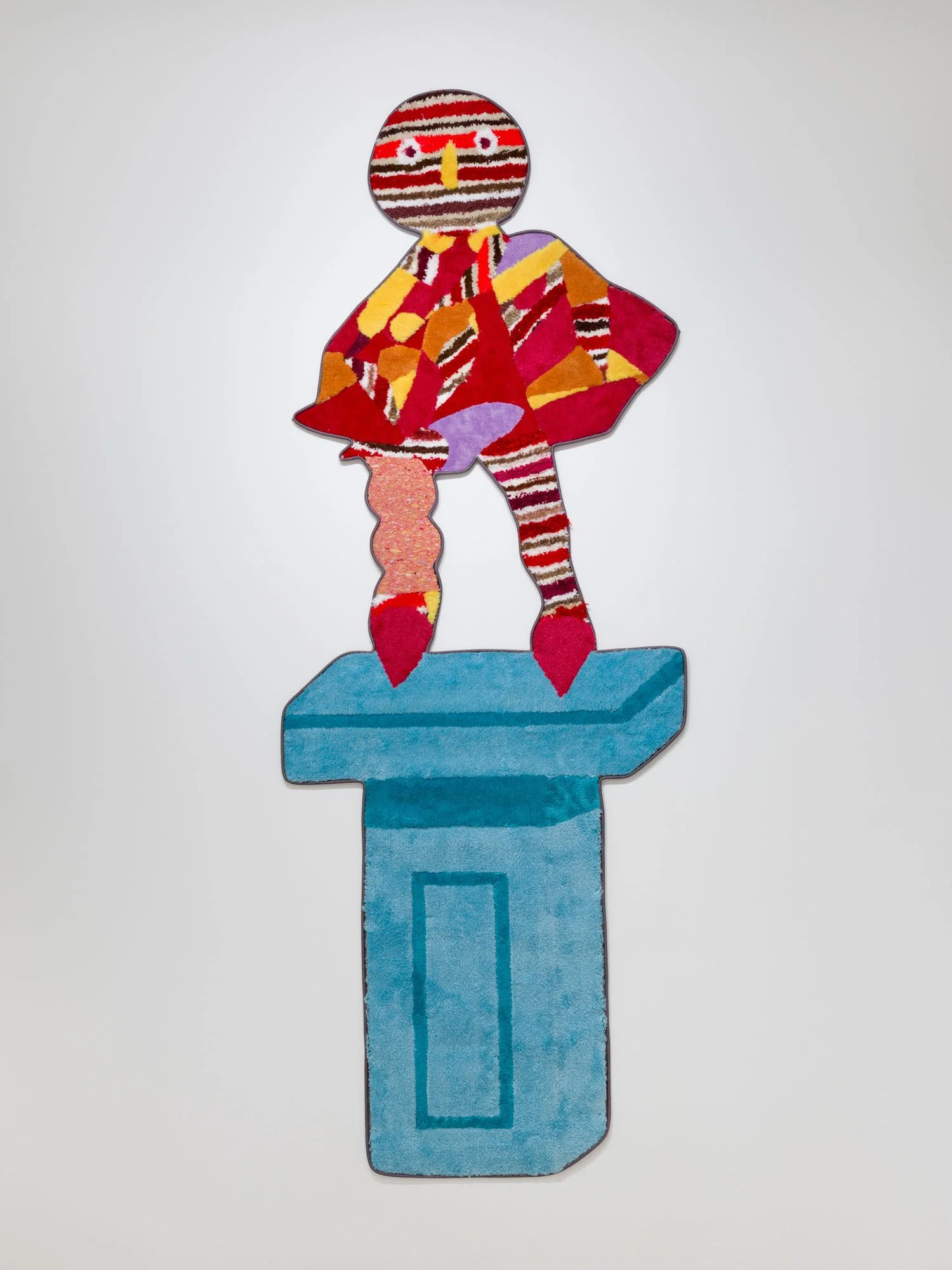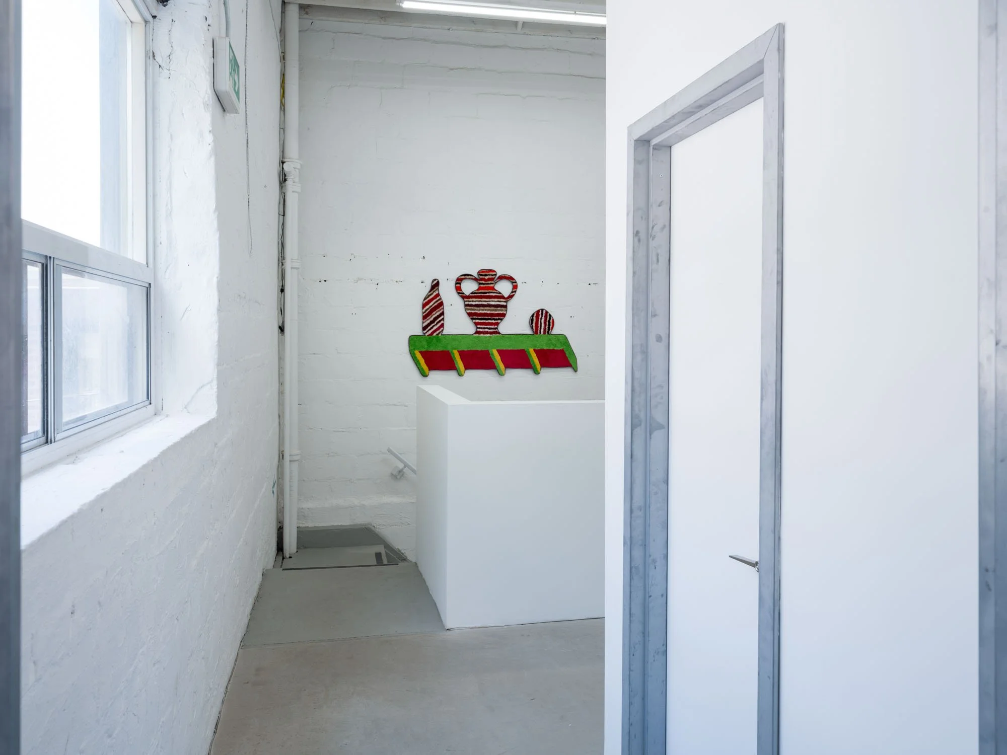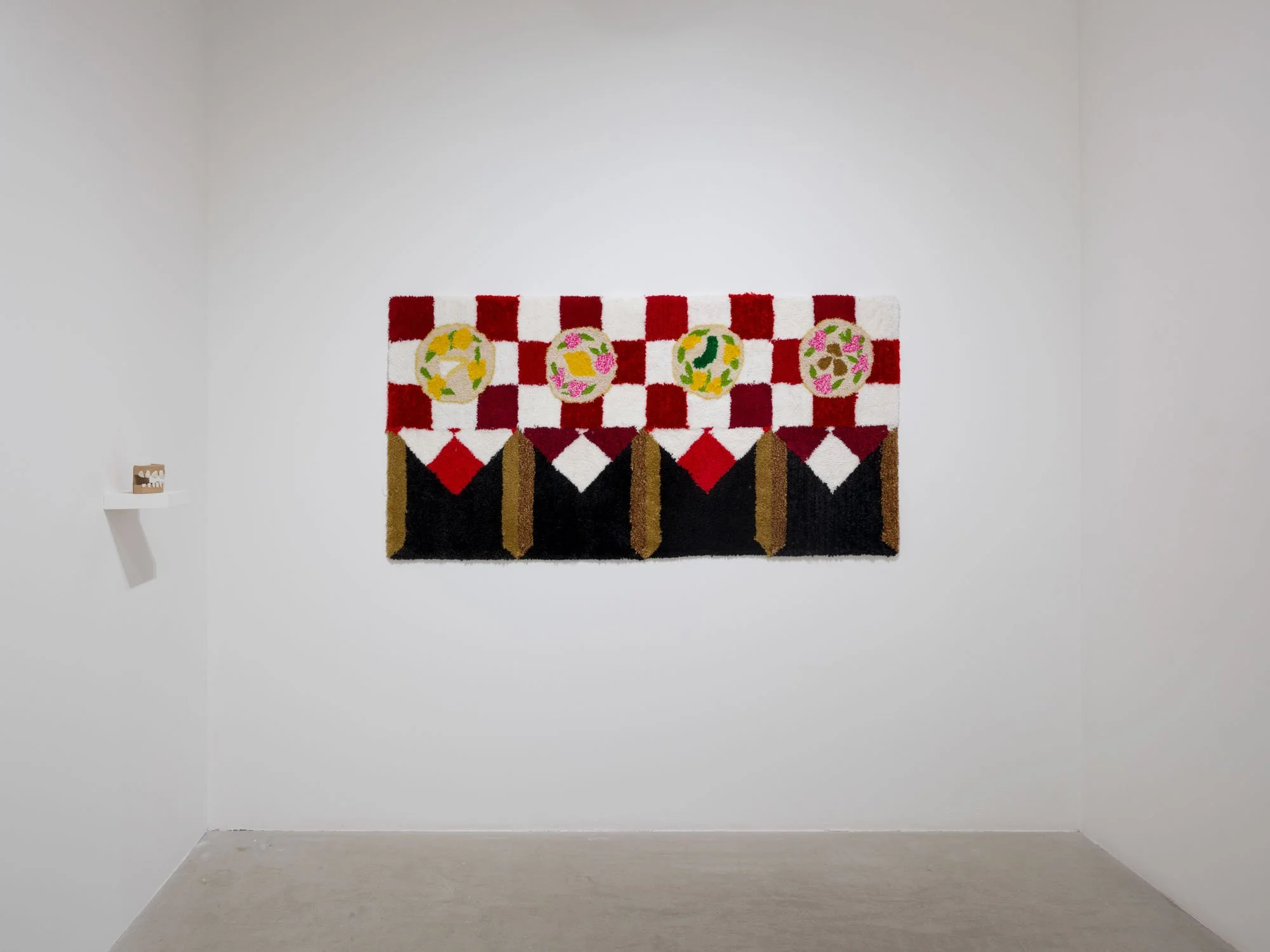 Then there are Jessica Campbell’s decorative objects on various shelves and plinths all made from collaged carpet. The first glaring issue with these sculptures is, of course, that they are missing a dimension. This missing axis is disguised by a sort of fool’s trompe l’oeil effect, where often incongruent, skewed views are rendered two-dimensionally, setting up different perspectives to support Man Cave decorations, statues for the Rec Room, and other pieces of decor that might be well suited to “a room of one’s own.” The titles of Campbell’s works (like Alcyoneus (Fighting my Dad about Climate Change)) allude to anecdotal histories that provide entry points to talk about bigger concerns and questions, working in tandem with the similarly relatable carpeting. Many of them are quite funny. Now I am laughing. What the hell is going on?